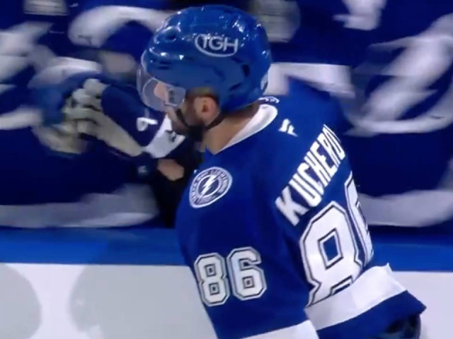 Watch as Tampa Bay Lightning forward Nikita Kucherov finds some open space and buries a one-timer off a cross-ice feed from Darren Raddysh to open the scoring against the Vancouver Canucks.