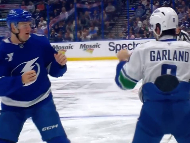 Watch as Vancouver Canucks forward Conor Garland squares off with Tampa Bay Lightning defenceman Darren Raddysh behind the play less than two minutes into their matchup.