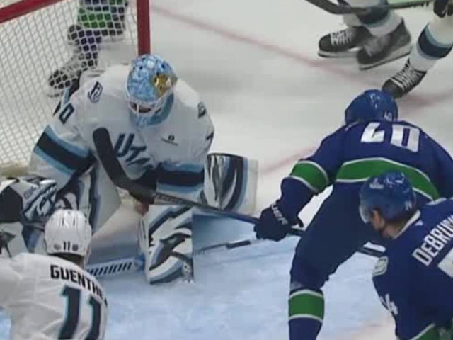 Vancouver Canucks forward Arshdeep Bains picks up his first goal of the season and the second of his career on a tip in front of the net to beat Utah Mammoth netminder Karel Vejmelka early in the third period.